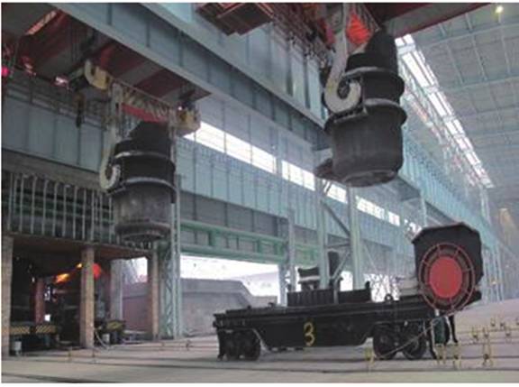 ③鐵水轉入線位于轉爐冶煉跨中心,可實現(xiàn)鐵水由中往兩側,廢鋼由兩側往中的最佳物流,為在同跨實現(xiàn)“雙聯(lián)”(脫磷、脫碳)工藝創(chuàng)造了絕好條件。