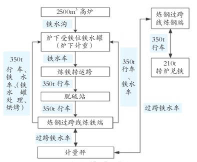 重鋼“一罐制”新技術以高爐與轉爐中心線平行的“工”字形布置為特征,以平車和吊車為主要運輸設備(見圖1),以“鐵包跟蹤系統(tǒng)”和“一罐制”信息化管理模塊為基礎信息系統(tǒng),其工藝流程如圖2所示。