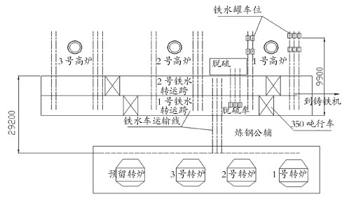 ④鐵水脫硫站緊靠高爐。鐵水脫硫站布置在鐵水轉運跨東側1號、2號高爐之間,改變了脫硫站緊靠煉鋼轉爐的傳統(tǒng)布置,大大優(yōu)化煉鋼加料跨工藝布置,解放了煉鋼吊車能力,為提高煉鋼能力、生產效率創(chuàng)造了條件。