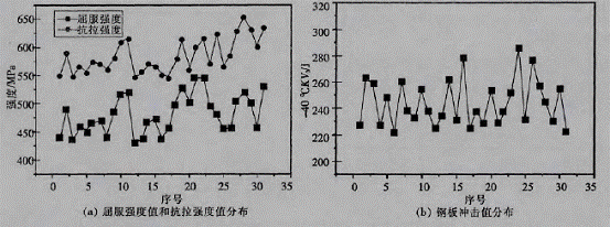 圖2:正火態(tài)Q370qE鋼板屈服強度值、抗拉強度值和沖擊功值的分布