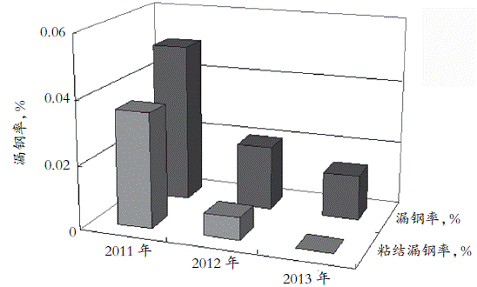 2013年下半年后已經(jīng)實現(xiàn)300萬t無漏鋼,17個月以上未發(fā)生粘結漏鋼。2011年后漏鋼發(fā)生率變化如圖1所示。