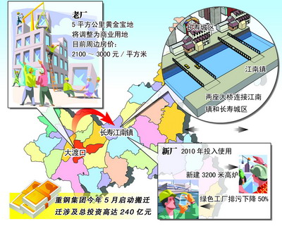 2007年5月17日上午10點(diǎn)15分,位于長(zhǎng)壽區(qū)江南鎮(zhèn)的重鋼新廠正式奠基開(kāi)工,2010年新重鋼將正式投產(chǎn),老廠停產(chǎn)。這次搬遷是繼首鋼之后國(guó)內(nèi)第二個(gè)實(shí)施環(huán)保搬遷的特大型鋼鐵企業(yè)。