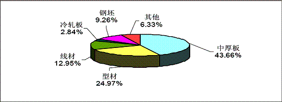 重鋼主要產品為4 大類:中厚板、型材、線材、冷軋板。其中,中厚板是公司的拳頭產品,也是公司盈利的主要來源,2006 年在主營毛利中中厚板占比高達86.19%。
