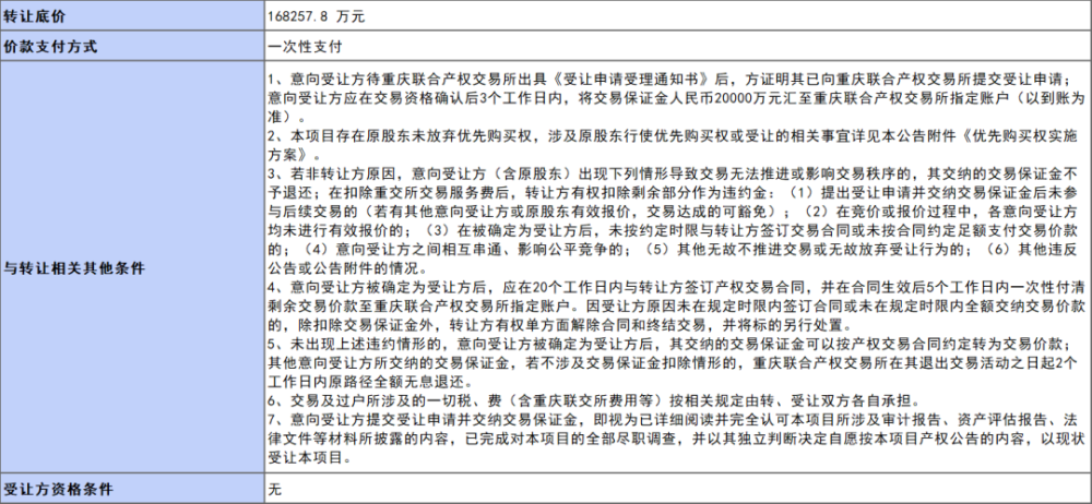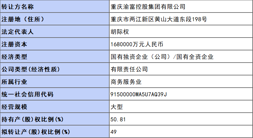 5月17日,重慶產(chǎn)權(quán)交易網(wǎng)掛牌披露重慶鋼鐵集團礦業(yè)有限公司(以下簡稱重鋼礦業(yè)公司)49%股權(quán)信息。2022年5月17日至7月12日,重慶渝富控股集團有限公司(持有重鋼礦業(yè)公司50.81%股權(quán))將掛牌轉(zhuǎn)讓其中的49%股權(quán),轉(zhuǎn)讓底價為168257.8萬元。