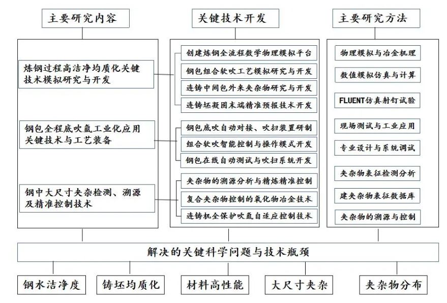 針對(duì)現(xiàn)有精品鋼潔凈化冶煉的突出問(wèn)題和行業(yè)難題,課題組經(jīng)系統(tǒng)調(diào)研,確定了項(xiàng)目的主要研究?jī)?nèi)容、關(guān)鍵技術(shù)開(kāi)發(fā)和主要研究方法,確立了項(xiàng)目總體思路。見(jiàn)圖1.