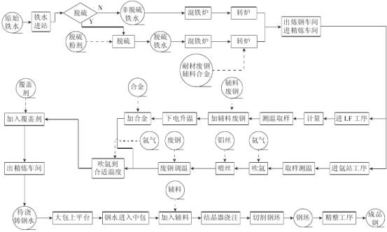 二級(jí)計(jì)量與三級(jí)計(jì)量的差異,通過系統(tǒng)歷史分析系數(shù),將系數(shù)納入到二級(jí)計(jì)量與三級(jí)計(jì)量的數(shù)據(jù)調(diào)整中。減少兩者之間的數(shù)據(jù)差距,確保動(dòng)態(tài)成本計(jì)算數(shù)據(jù)中的準(zhǔn)確性。煉鋼環(huán)節(jié)物流圖如圖1所示。
