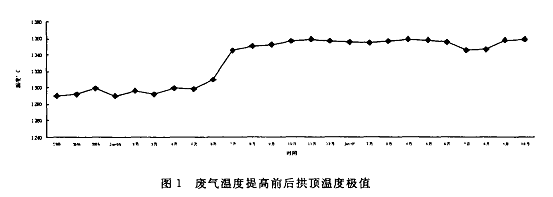 重鋼5號高爐采用了熱風爐煙氣余熱回收預熱助燃空氣和煤氣。高爐熱風爐排放的煙氣數(shù)量大,將其回收可以提高熱效率,還可用回收的熱量提高風溫。為了提高風溫,決定將5號高爐熱風爐的廢氣溫度由從前的350度提高到380度,這樣就間接提高了風溫。圖1為廢氣溫度提高前后拱頂溫度極值情況。