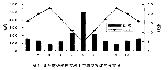 圖2為五高爐多環(huán)布料后的十字測溫和煤氣分布圖。
