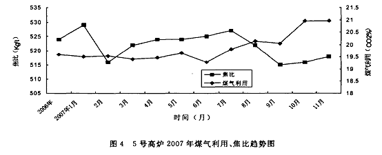 隨著風溫使用值的提高和多環(huán)布料的實施,5號高爐煤氣利用從以前的19.5%左右提高到了21.0%,焦比也由2006年的530Kg/t左右降低到了目前的515Kg/t左右(圖4)。